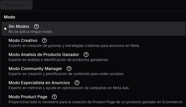 EcomClub IA cuenta con varios modos especializados para brindarte respuestas más precisas según tus necesidades. A continuación, te explicamos cómo usar cada uno: