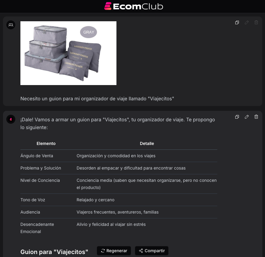 En este caso, solo le dimos una captura del producto y le pedimos el guion. Antes de darte el guión, EcomClub arma una pequeña tabla para que sepas en qué estrategias de venta y niveles de conciencia de tu público va a intentar basarse para escribir el guión.